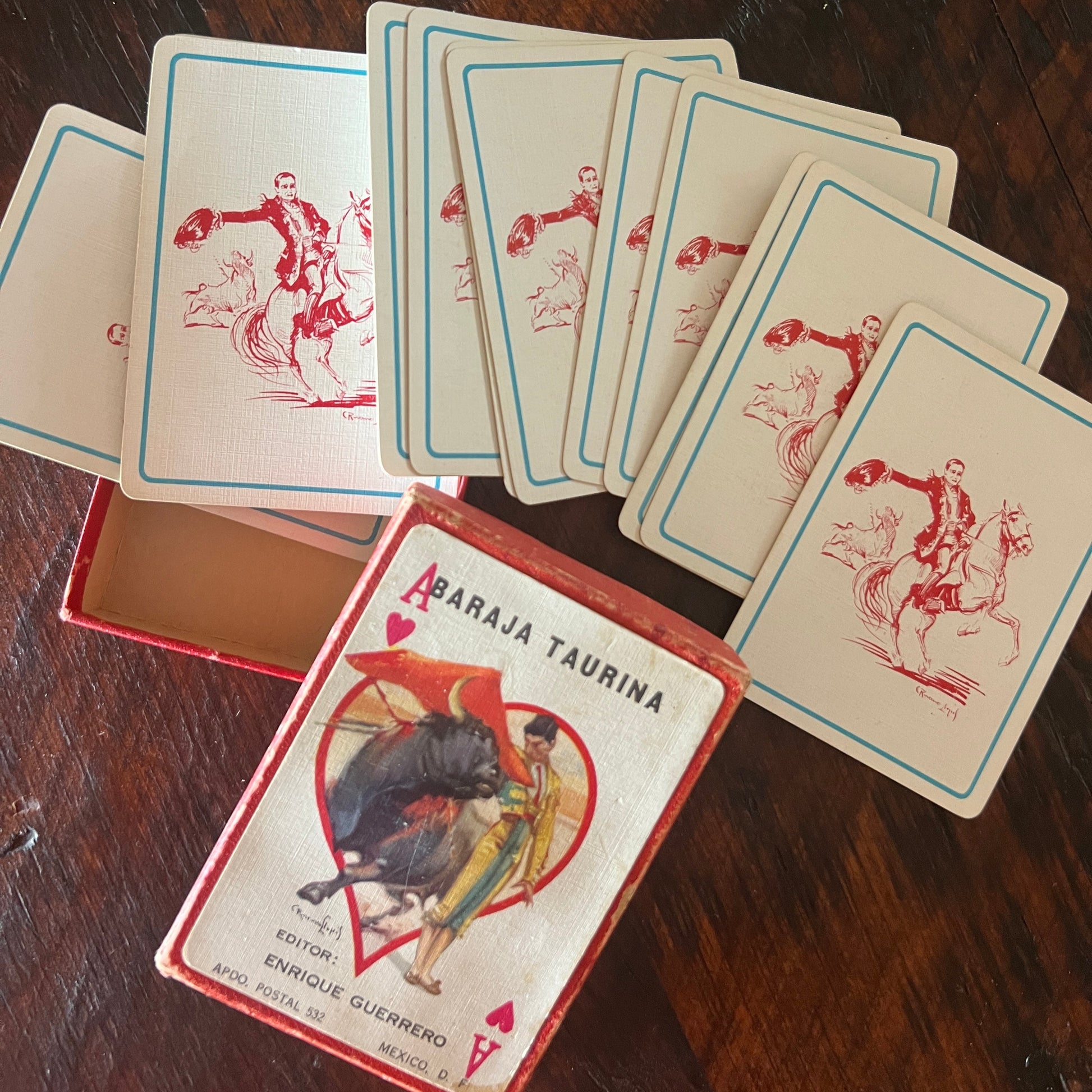 Full set of Baraja Taurina bull fighting playing cards from the 1950's. Each card has a different bullfighting scene. These beautiful scenes were created by artist, Carlos Guano Llopis, a Spanish bull fight artist from Valencia, Spain.