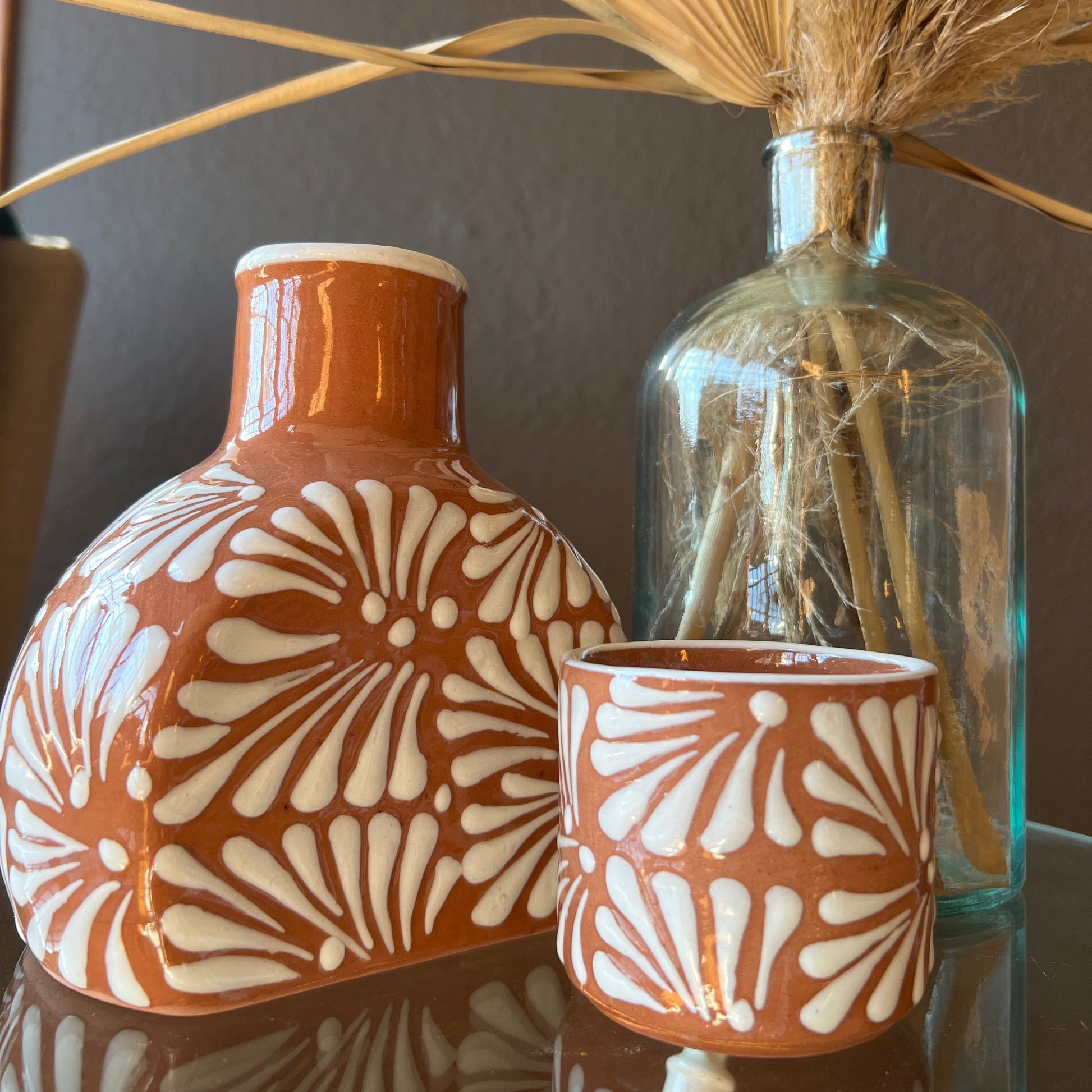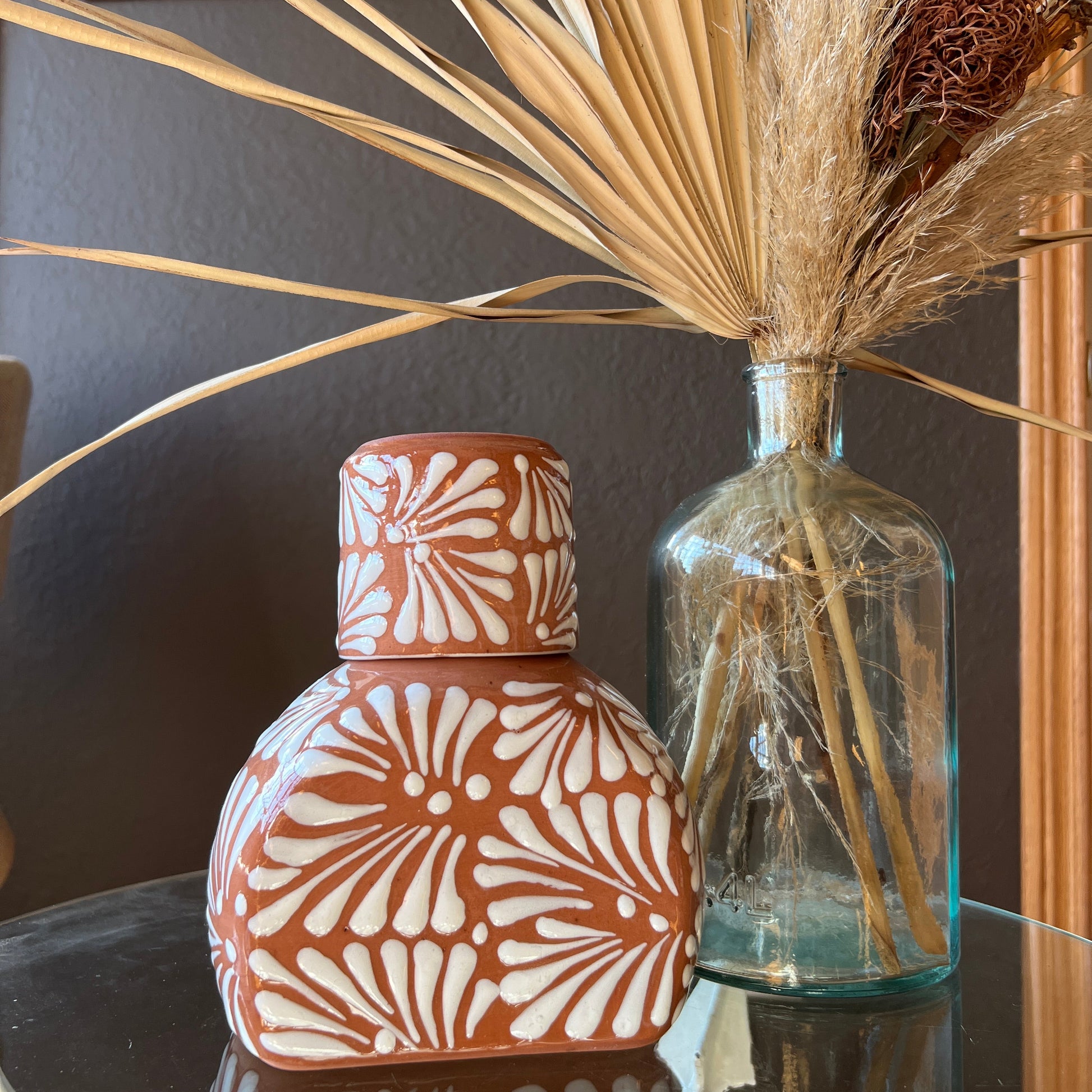 Handmade mexican clay talavera carafe with cup. Such a gorgeous bedside addition or barware upgrade!